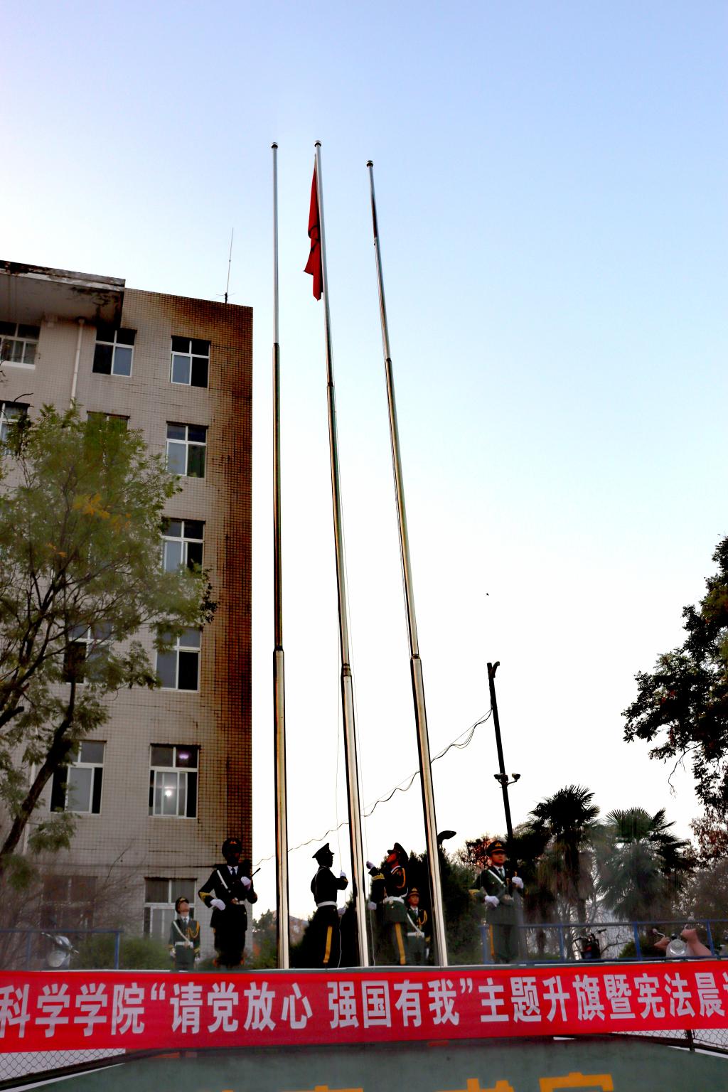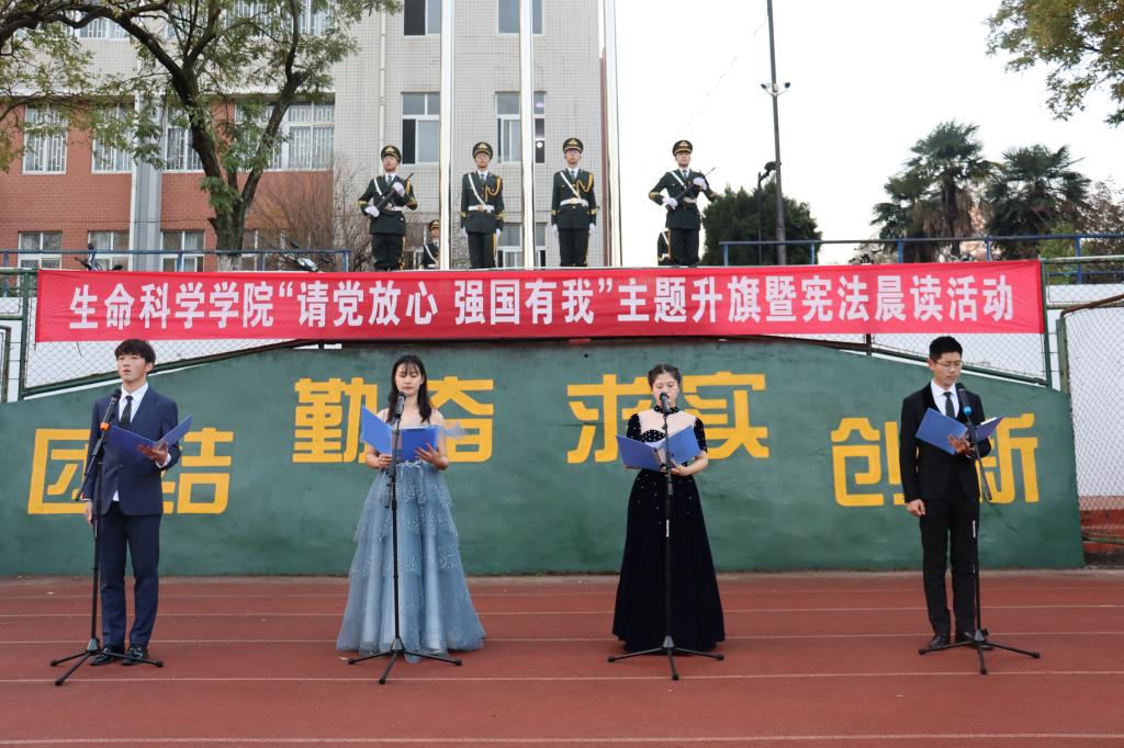 本网讯11月29日早上7点,生命科学学院在校第一运动场举行“请党放心 强国有我”主题升旗仪式暨宪法晨读活动。校党委学生工作部、武装部、学生处(部)处长姚莉,党委武装部副部长兼学生处副处长刘柳,学生处副处长周涛,学院党政领导、教师代表、全体专兼职辅导员和在校学生参加了此次活动。仪式由学院党委副书记闫大玮主持。