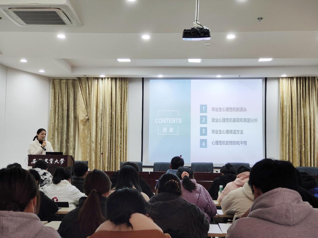 本网讯11月26日,资源与环境学院在中西部大楼久易报告厅举办毕业生就业心理调试讲座,一级职业指导师、二级心理咨询师钱慧老师现场授课,50名大四学生聆听了讲座。