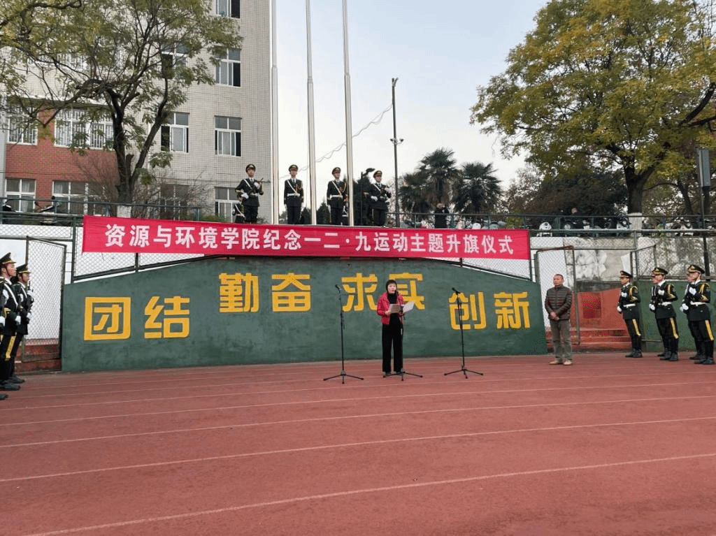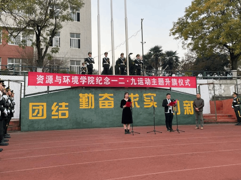 本网讯12月6日晨,资源与环境学院在校第一运动场举行“纪念一二•九运动”主题升旗仪式。校党委学生工作部、武装部、学生处(学生资助管理中心)领导姚莉、刘柳、周涛出席仪式,学院党政领导、专兼职辅导员和全体学生参加了活动。升旗仪式由学院党委副书记、纪委书记、副院长姚洪章主持。