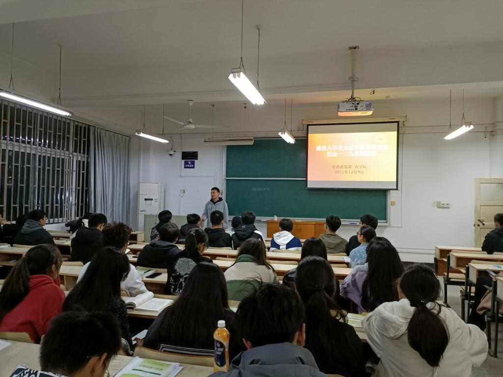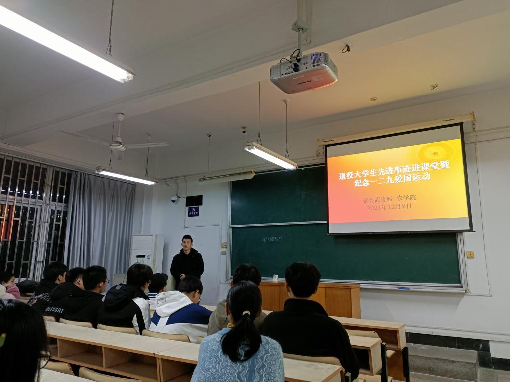 本网讯为弘扬爱国主义精神,巩固学生专业思想,培育“一懂两爱”的新农人,农学院联合校党委武装部,于12月9日晚在勤学楼306教室开展了退役大学生先进事迹进课堂暨纪念一二·九爱国运动。校党委武装部副部长刘柳、农学院党委副书记吕大鹏出席,农学院专职辅导员、2021级新生及国旗护卫队队员代表参会。