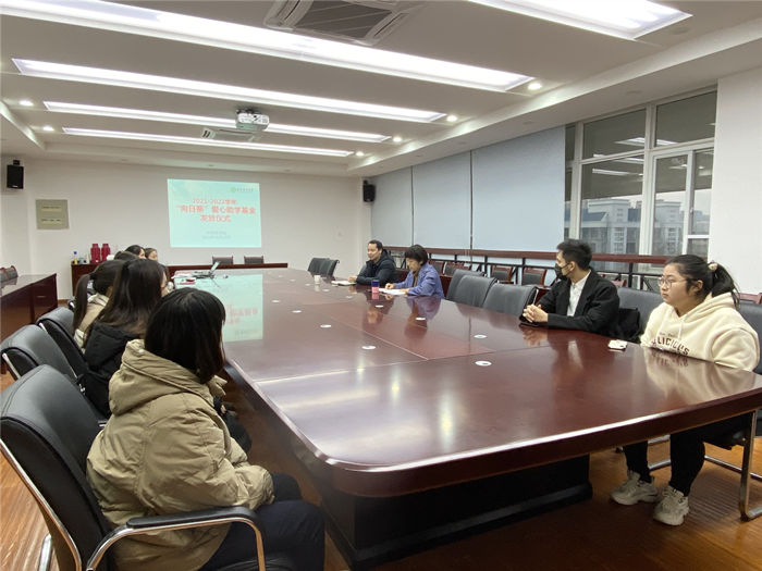 本网讯12月17日下午,外国语学院2021-2022学年“向日葵”爱心助学基金发放仪式在外语楼506会议室举行,学院党委副书记姬惠惠、副院长许宗瑞及获得2021-2022学年“向日葵”爱心助基金的全体学生参加仪式。