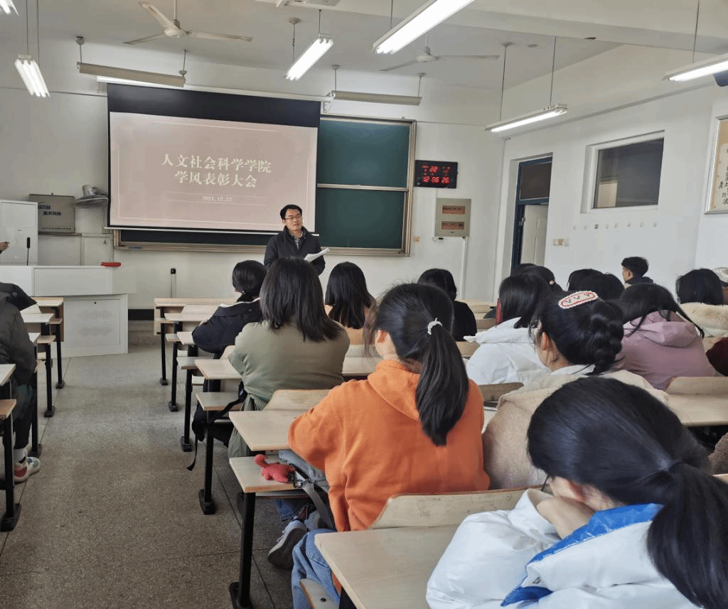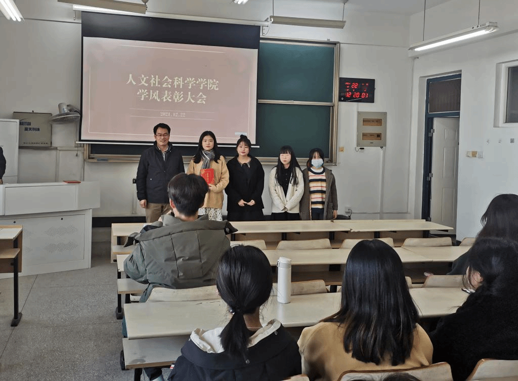 本网讯12月22日上午,人文社会科学学院在人文楼608教室举行2021年学风表彰大会。学院党委副书记吴永红、专职辅导员、优秀学生代表以及2021级班委参加大会。
