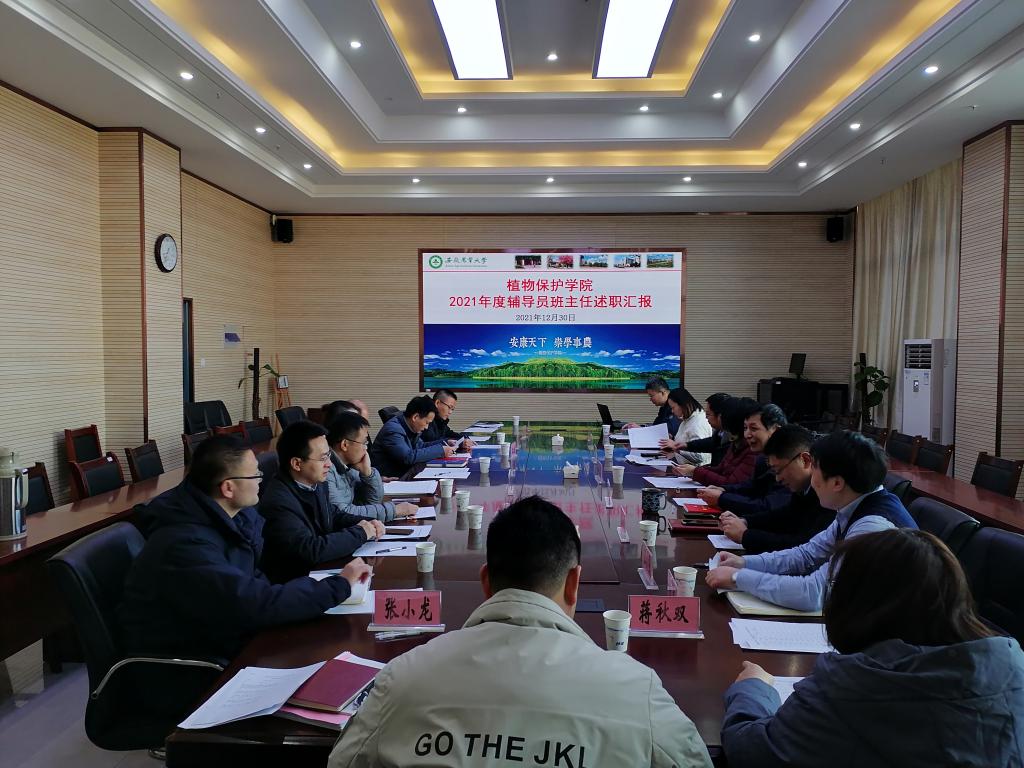 本网讯 12月30日上午,植物保护学院在中西部大楼1213会议室召开2021年度专兼职辅导员述职报告会。学工部(处)处长姚莉,学院党委书记张平、常务副院长潘月敏、副院长唐庆峰、张华建出席会议。会议由院党委副书记、纪委书记、副院长汪小强主持。
