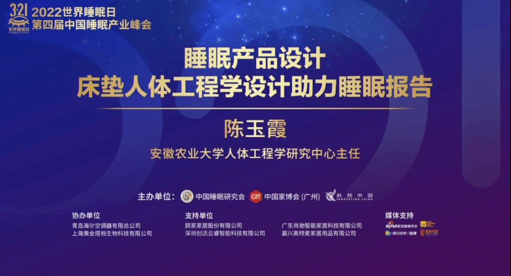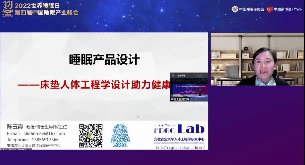 本网讯 3月21日,2022年世界睡眠日•第四届睡眠产业峰会在线上顺利召开。林学与园林学院人体工程学研究中心主任、教授陈玉霞受邀参会并做题为《睡眠产品设计—床垫人体工程学设计助力健康睡眠》的专题报告。