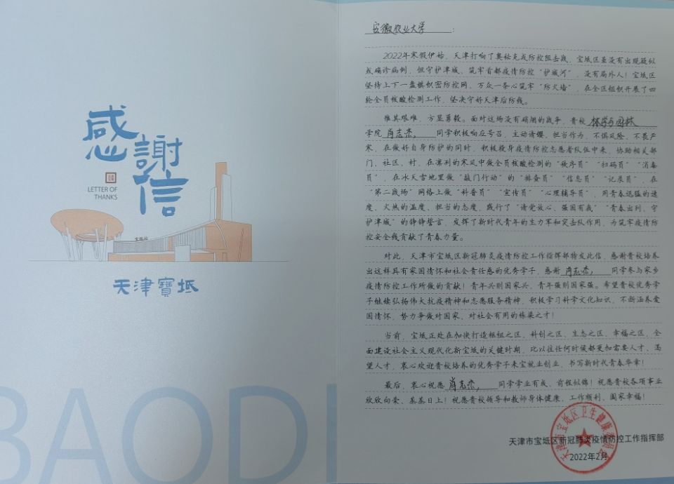 本网讯 3月23日,林学与园林学院收到天津市宝坻区新冠肺炎疫情防控工作指挥部寄来的对学院学生肖志杰的感谢函。