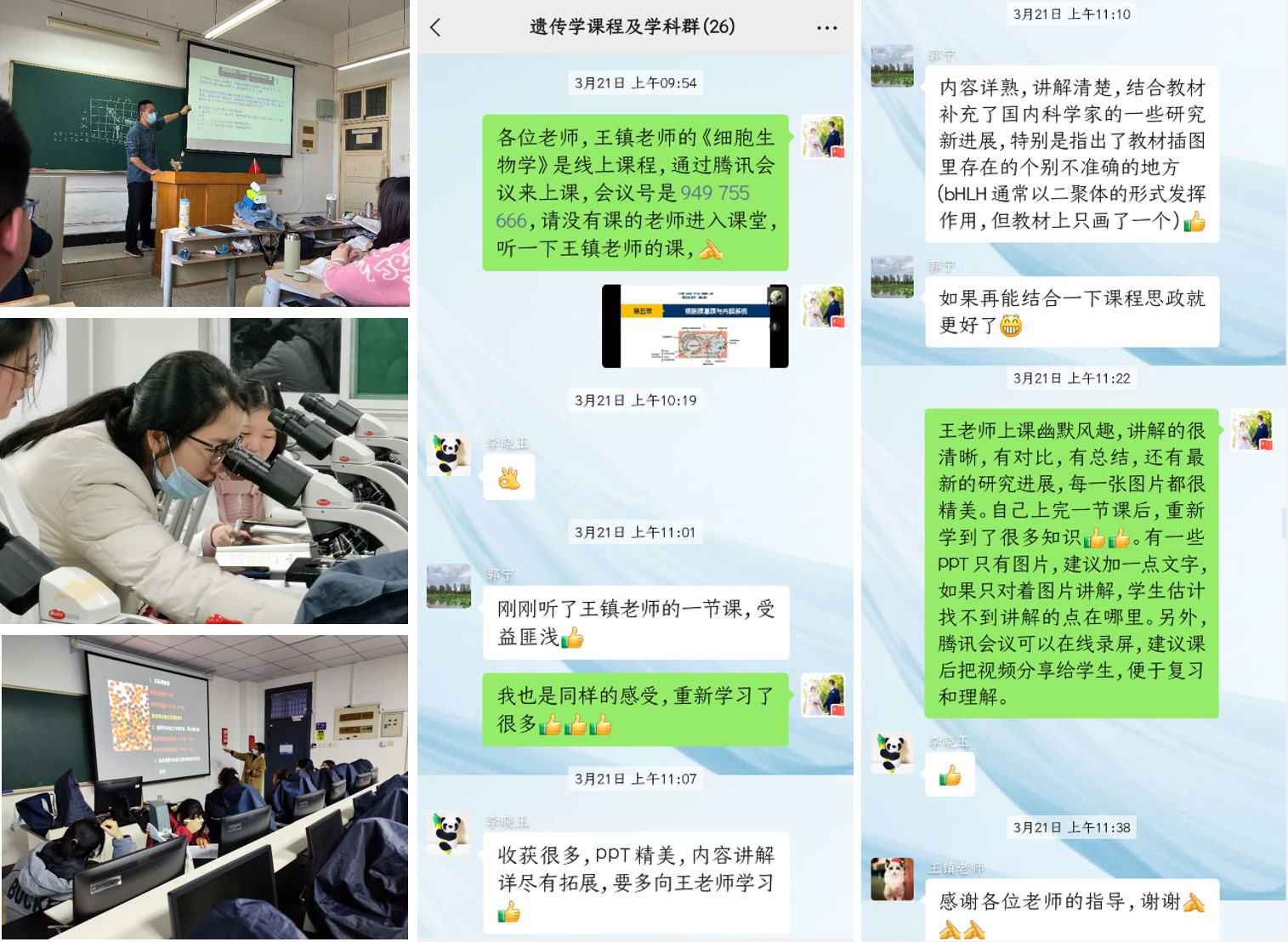 3月21日-3月22日,生命科学学院院长江海洋带领教工第五支部教师与遗传与分子课程组分别观摩了理论课《细胞生物学》线上课程与《生物信息学》线下课程;3月24晚,大家集中在10教2楼实验教学室共同观摩了《遗传学》实验课。观摩后,大家热烈交流,深入讨论,既肯定了各任课老师的教学风格和创新方法,又深入剖析了教学过程中所暴露出来的问题,达到了良好的交流学习效果。