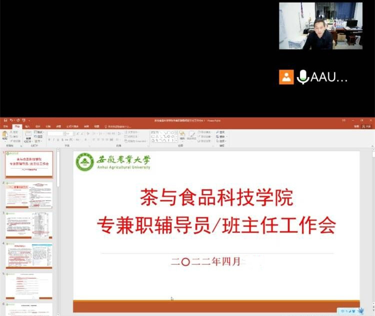 本网讯 4月7日晚,茶与食品科技学院通过腾讯会议召开线上专兼职辅导员工作会议,学院党委书记唐红萍和全体专兼职辅导员参加会议,会议由学院党委副书记夏业鲍主持。