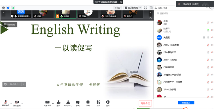 本网讯 为提升我校广大学生外语学习兴趣和学习热情,把“我为师生办实事”要求继续落细落实,4月15日晚外国语学院在云端举办新学期“大外讲堂”。本次讲座为“大外讲堂”系列第三讲,由大学英语教学部副教授黄媛媛主讲,全校百余名学生和大学英语教学部教师线上参与。