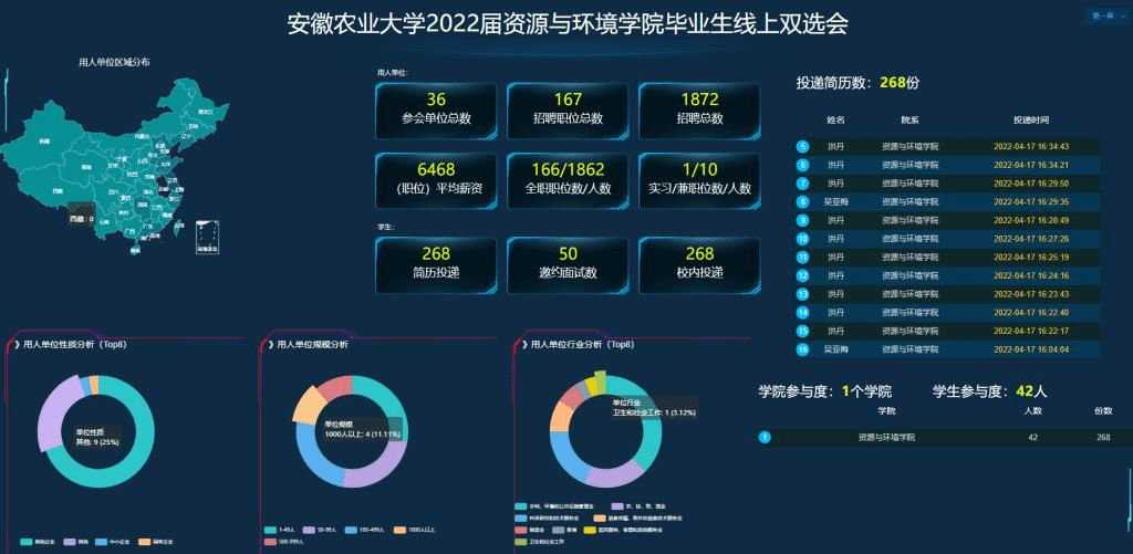 在学院前期重点邀请、用人单位自主报名基础上,经过全面审核遴选,本次招聘会共确定了包括安徽华测检测技术有限公司、安徽久易农业股份有限公司等36余家省内外优质参会企业,提供招聘岗位167个,招聘职位1872个。截至4月17日下午18时,毕业生通过平台投递简历267份,邀约面试50余人次。