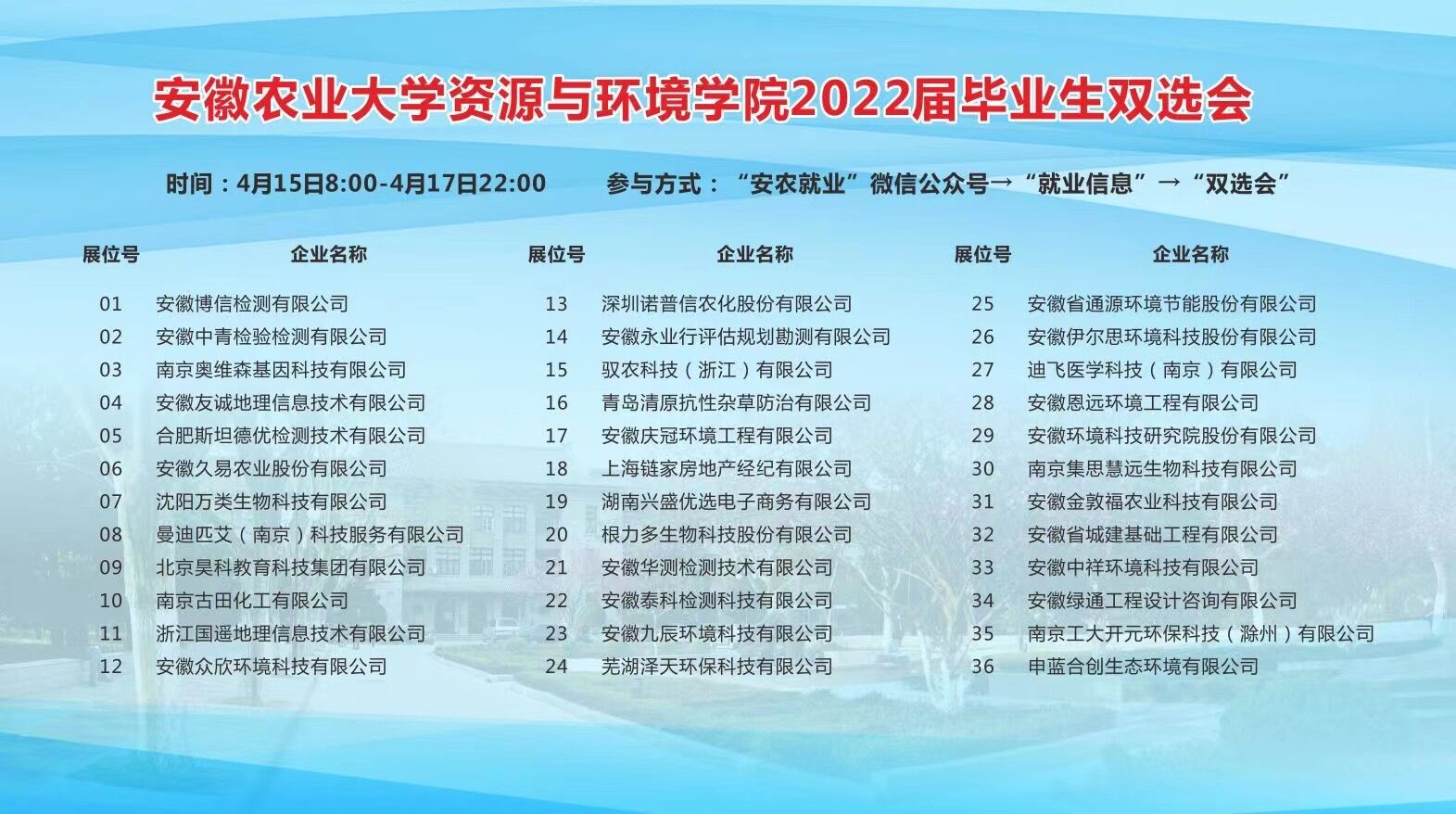 本网讯 为确保疫情防控期间就业指导与服务工作“不断线”,进一步促进2022届毕业生高质量就业, 4月15日至4月17日,资源与环境学院举办了2022届毕业生空中双选会。