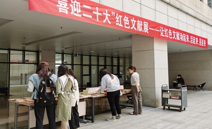 为迎接党的二十大胜利召开,用好红色资源,赓续红色基因,满足广大师生“读原著、学原文、悟原理”的需求,发挥馆藏红色文献的价值引领作用,图书馆经过系统整理,从现有馆藏中挑选出建国初期及新中国成立前出版的部分马克思、恩格斯、毛泽东等的经典著作、革命人物传记、书信及重要会议文件等图书200余册和青禾书店部分新书进行展出。展出期间,数百名师生陆续前来观看,现场借出图书20余册。