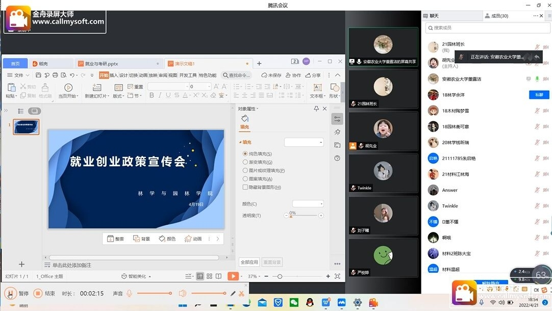本网讯 为了引导大学生了解就业创业知识,提高就业创业能力,激发当代大学生的就业创业热情,同时进一步落实我院实践育人的教育方针,深化就业创业工作,促进大学生走自主创业之路,实现以创业带动就业,以实践深化理论的培育目标。林学与园林学院于4月24日晚在腾讯会议举办就业创业政策宣传会,由学院就业联络员主持,学院各年级专业同学参加本次会议。