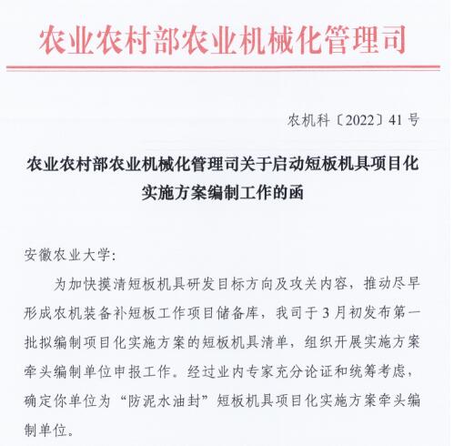 本网讯 近日,农业农村部农业机械化管理司向学校来函,确定我校为“防泥水油封”短板机具项目化实施方案牵头编制单位,工学院教授陈永新为项目化实施方案编制工作牵头专家。