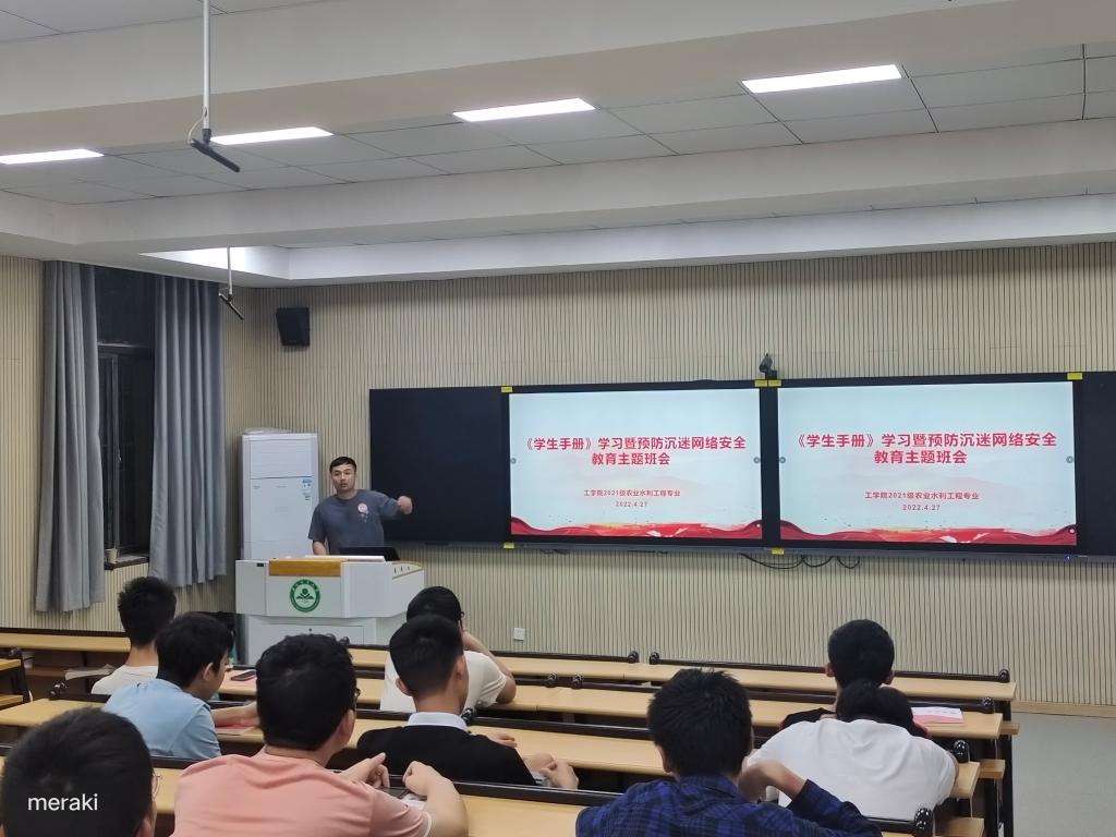 规矩意识“立”起来。4月25日-4月30日,学院各班级线上线下召开主题班会对新修订《学生手册》再学习、再强调。班会重点从火灾、财产以及人身安全三个方面向同学们介绍宿舍里可能存在的安全隐患,并就如何防范进行讲解,明确宿舍中禁止使用违规电器,注意防火、防盗。班会还就《学生手册》中评奖评优等进行学习解读。