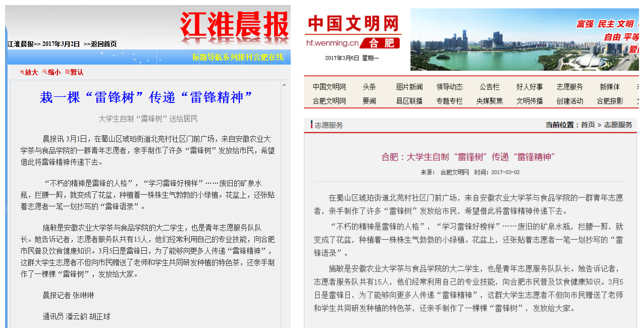 为进一步弘扬“奉献、友爱、互助、进步”的志愿服务精神,更好地展现安农学子形象,在雷锋日来临之际,茶与食品科技学院积极开展“寻觅雷锋足迹,弘扬奉献精神”学雷锋主题系列活动。