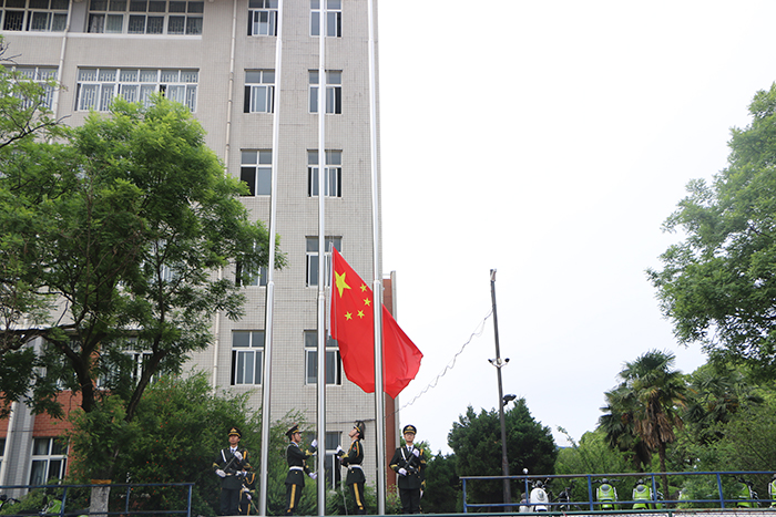 仪式于上午7时准时开始,国旗护卫队迎着朝阳,以饱满的热情,庄严的护卫五星红旗。伴随着雄壮有力的《义勇军进行曲》响彻整个校园,全体肃立向国旗集体行注目礼,齐声高唱中华人民共和国国歌。鲜艳的五星红旗冉冉升起,点燃了师生强烈的爱国热情。