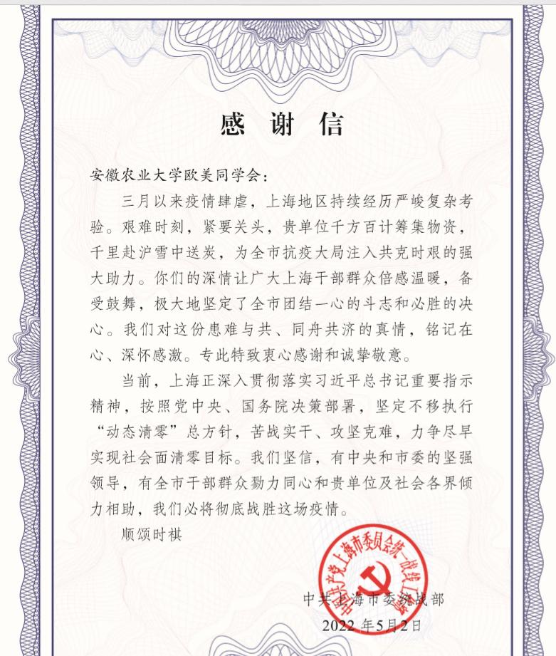 本网讯 今年3-4月份,上海疫情形势严峻,牵动全国人民的心。在得知上海宝山区急需防护服、目镜、手套等防疫物资和蔬菜等生活物资后,我校欧美同学会在校党委统战部统一领导下,积极响应省欧美同学会号召,迅速行动,发挥各自优势,筹集抗疫物资捐助上海,凝心聚力,共克时艰。