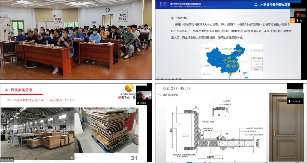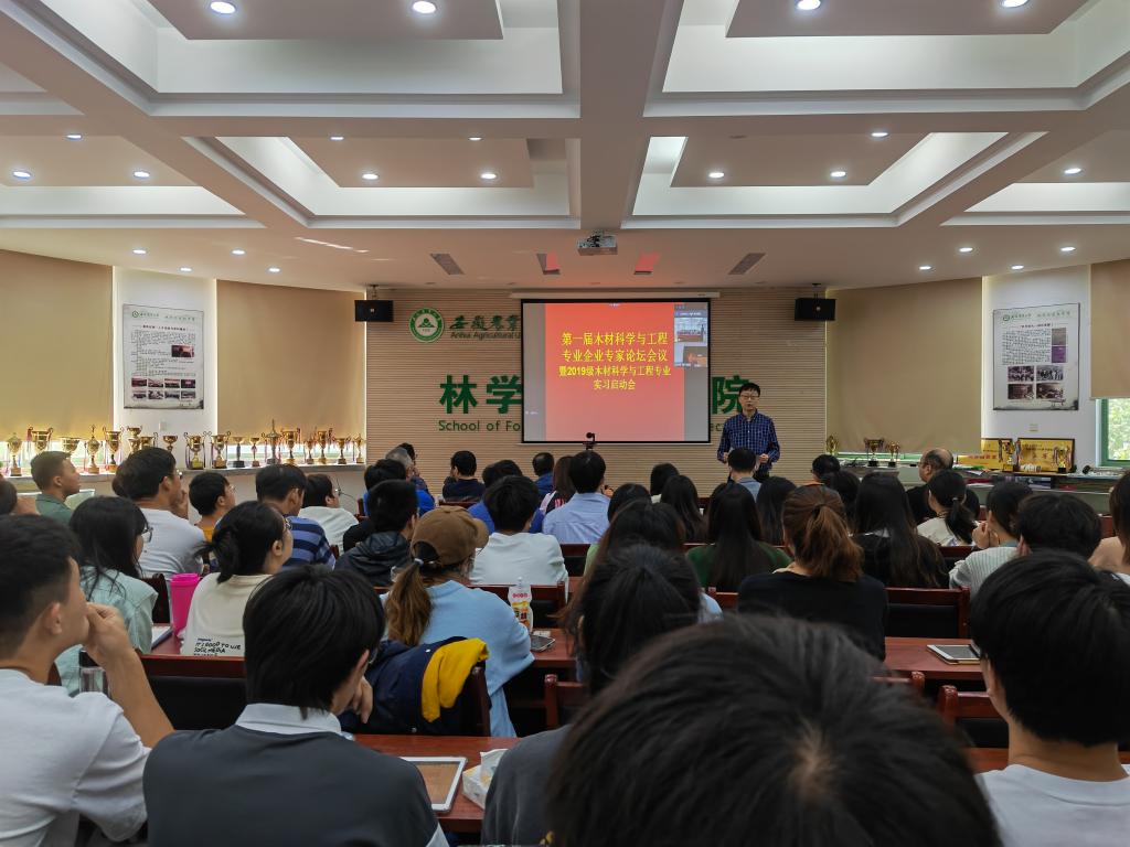 本网讯 5月15日,为促进学院学生对专业的认知,创新实践教育模式,第一届木材科学与工程专业企业专家论坛暨2019级木材科学与工程专业实习启动会在林学楼二楼报告厅召开。论坛邀请了来自德尔未来科技控股集团股份有限公司、广州酷匠信息科技有限公司、安徽尚佰智能家居有限公司、大亚人造板集团有限公司、客来福家居股份有限公司、安徽群益木业有限公司等企业的专家分别围绕木地板、家具信息化生产技术、木门、人造板、定制家居、人造板饰面等主题线上线下同时开展报告,林产工业系全体教师和2019级木材专业全体同学线下出席,低年级同学线上聆听。