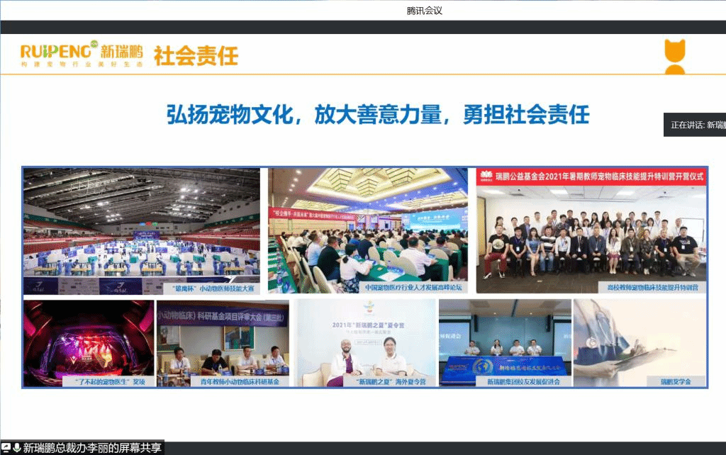 李丽在报告中围绕着国内外宠物行业现状、宠物行业企业建设实例、职业生涯规划设计、行业发展与人才培养的困境以及动物医学人才培养探索实践等方面深入分析了当今宠物医疗行业的发展。演讲中,李丽用生动感人的故事、诙谐幽默的语言吸引和打动了每一位学生。期间,瑞鹏宠物医疗集团还邀请了部分优秀校友分享自己的职业规划和求职经历。演讲结束后,李丽就同学们对宠物诊疗行业未来发展存在的疑惑、对未来从事该专业工作存在的迷茫进行了线上互动交流。