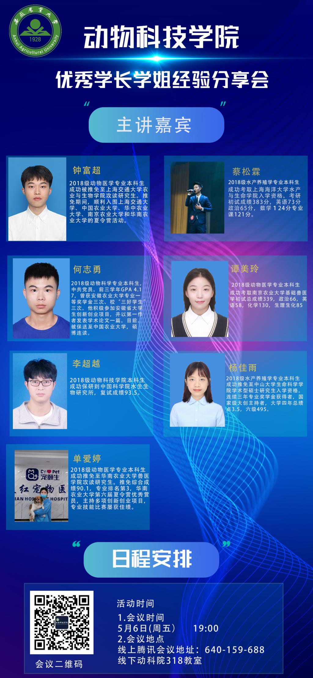 举办优秀学长学姐经验分享会。为帮助同学明确目标,合理规划学业生涯,5月6日,动物科技学院在线上线下同步举办优秀学长学姐经验交流分享会,邀请学长学姐结合自身经历,就保研、考研等方面分享经验,各年级同学参与会议,积极交流。
