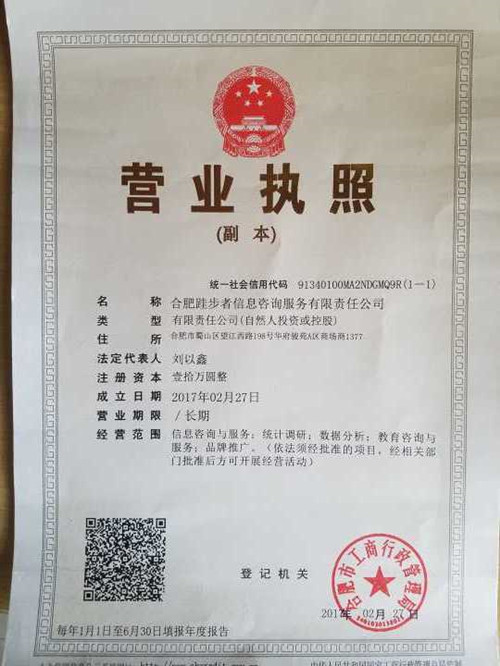 合肥跬步者信息咨询服务有限责任公司是由理学院2016级应用统计学专业全体同学依托所学专业及所在学院的基础学科背景联合创办的。由学生班费注册,学生担任法人代表。公司主营信息咨询与服务、统计调查、数据分析、教育咨询与服务、品牌推广等。