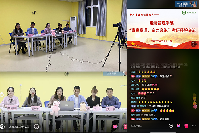 考研沙龙勇奔跑。5月11日,“青春赛道,奋力奔跑”考研经验交流活动通过学院官方抖音账号全程直播。活动邀请了五位2018级考研成功的学生代表以考研时间轴为脉络,详细讲解了在备考期间应做的准备和注意的问题,包括考研计划、各科的复习方法、考研信心的树立、备考心态的调整、生活饮食习惯、作息时间安排以及选择专业方向和复试注意事项等方面。五位学生还在直播间和观看者进行了有效互动,详尽解答了同学们对考研复试、跨专业考研等方面的疑惑。