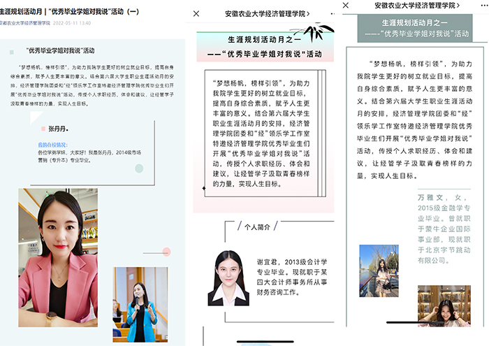 职场历练再领航。5月11日-5月19日,通过学院官微公众号分享了三位优秀毕业生踏入职场的经历,聚焦职业规划、求职经验和提升路径等三个方面,把自己从校园走入社会,从学生转为职场人士的所思所想讲给学弟学妹们听,真情实感,干货满满,也为即将踏入职场的毕业生们送上一把找准求职定位,明确奋斗目标的指南针。