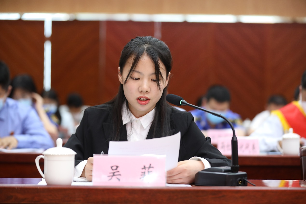 吴菲以“胸怀国之大者,用青春之信仰引领奋进之人生”为主题,分享了自身在大学期间参加科技创新创业竞赛的经历与感受,并表示要时刻牢记习近平总书记对青年大学生的嘱托与期望,坚定理想信念,勇于担当作为,保持锐意创新,涵养高尚品行,在青春的赛道上奋力奔跑,争取跑出当代青年的最好成绩!