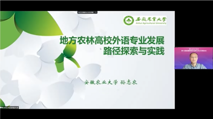 本网讯 近日,第十五届全国英语类专业院长/系主任高级论坛在线上举办,外国语学院组织教师积极参加,与全国外语界专家、老师一道,探讨新文科背景下英语专业内涵发展的建设路径。院长孙志农受大会邀请,在会上作了题为《地方农林高校外语专业发展路径探索与实践》的论坛报告。