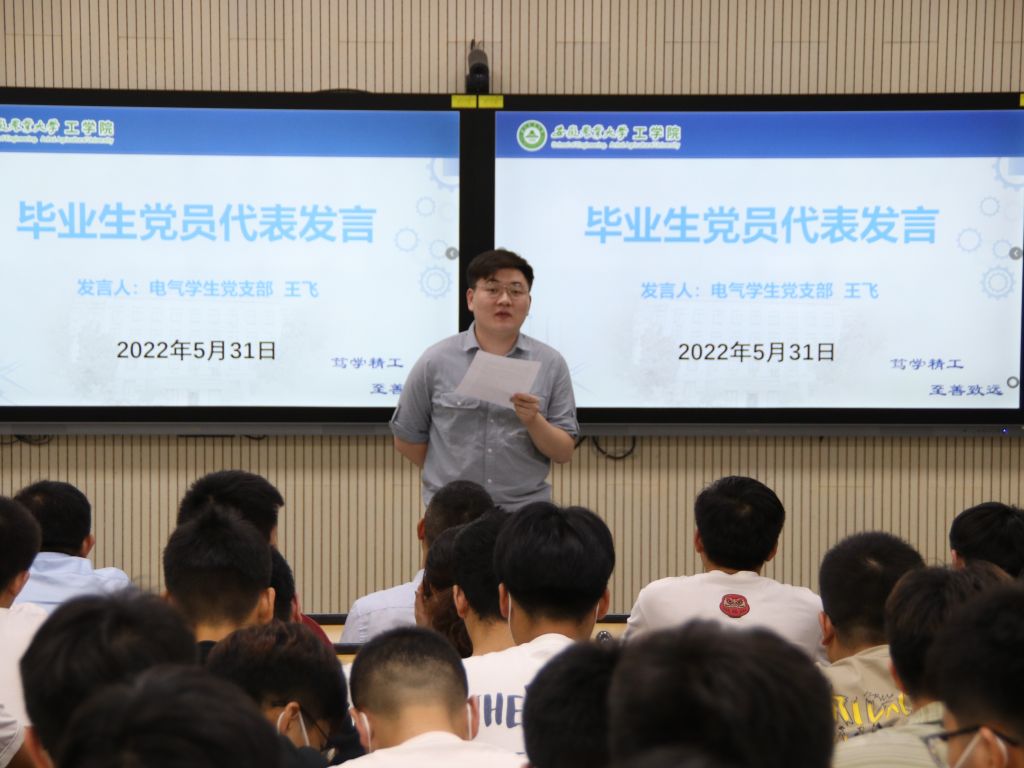 张国学以“新时代青年如何走好信仰之路、学习之路、奋斗之路”为主题,给毕业班党员主讲最后一堂党课,并要求大家在未来的人生道路上坚定信念,锤炼党性修养;要明德修身,发挥好党员先锋作用;要牢记使命,强化宗旨意识。同时鼓励同学们在新的人生起点上以党员的标准严格要求自己,在奋斗的道路上努力实现自己的人生价值。电气学生党支部王飞同学围绕自己在党组织的教育和培养过程中成长经历、思想历程,代表全体毕业班党员进行了主题发言。