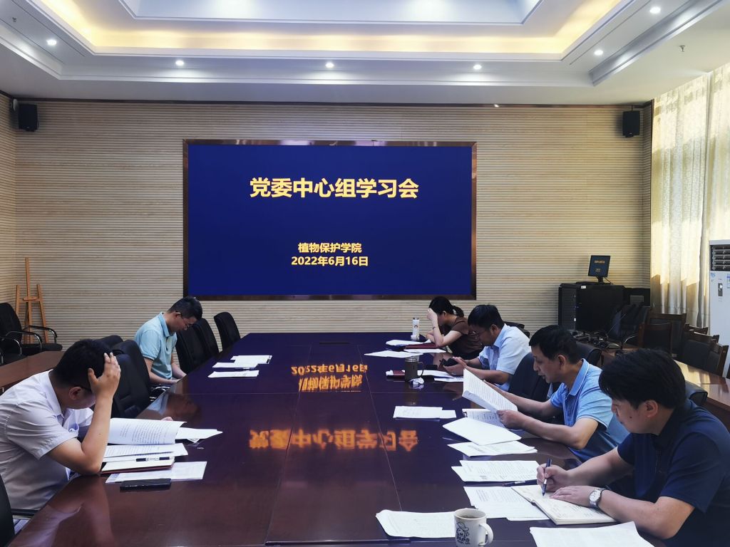 本网讯 6月16日,植物保护学院在中西部综合楼1213会议室组织召开党委中心组学习会,学院党委理论中心组成员参加会议。会议由院党委书记张平主持。