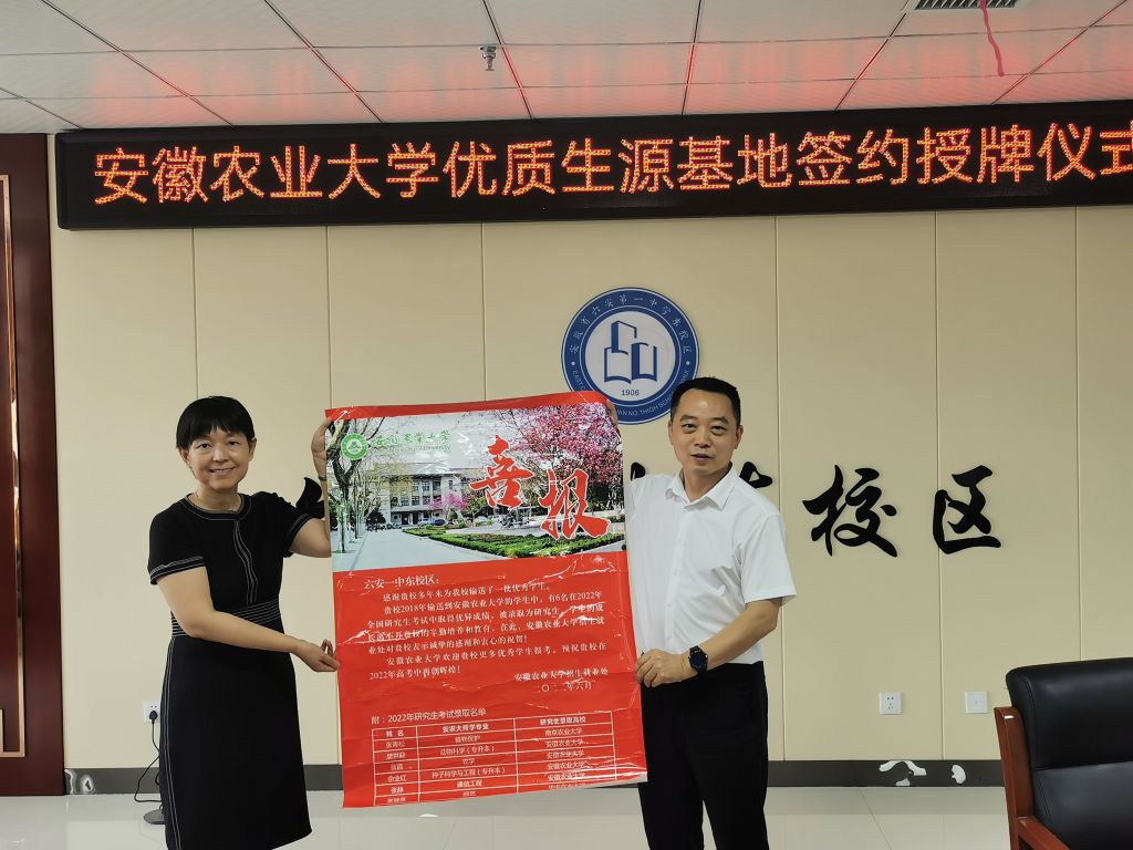 活动中,双方签订《安徽农业大学优质生源基地共建协议书》,并开展“安徽农业大学优质生源基地”挂牌仪式。姜红从办学历史、育人环境、办学层次、师资力量、办学成果、专业分布等方面对学校作了详细介绍。她充分肯定了六安一中东校区近年来的办学成果,对六安一中东校区每年为我校输送数十名优质生源表示感谢,并赠送了六安一中东校区在我校学子2022届考研喜报和学校定制的防疫物资。双方都表示将以此次签约授牌为起点,在新课改、新高考政策研究、教学研究、学生培养、生涯规划等多个方面密切交流与合作,共建“优质生源基地”,帮助更多优秀学子找准人生方向,成就美好人生。