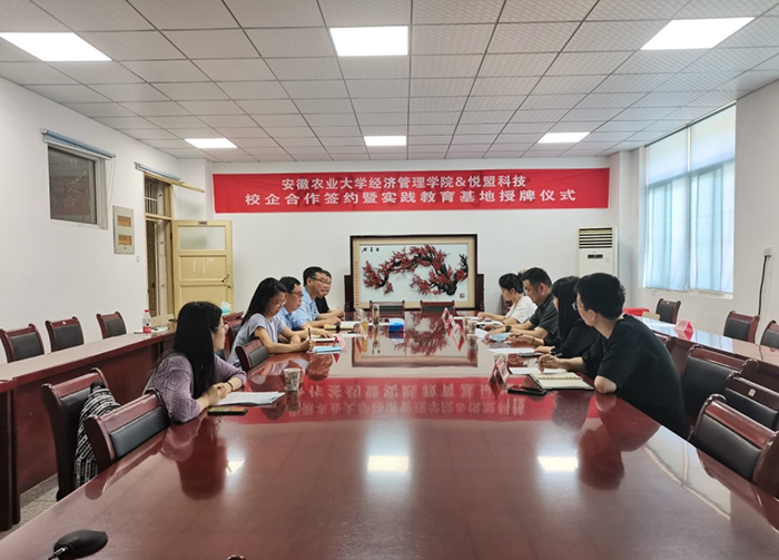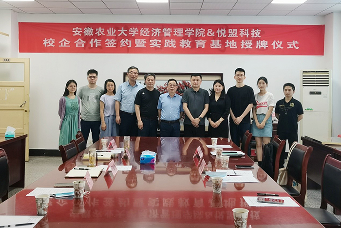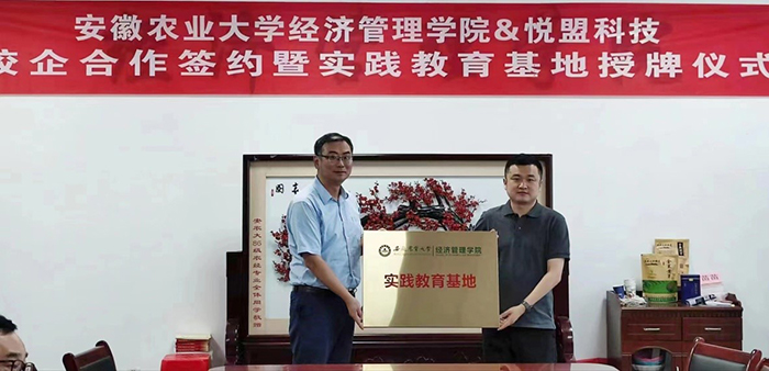田涛和张云峰分别代表校企双方签订了校企合作协议,并为悦盟科技授牌“安徽农业大学经济管理学院实践教育基地”。电子商务专业负责人邹能峰带领张云峰一行参观了学院教学实验基地。