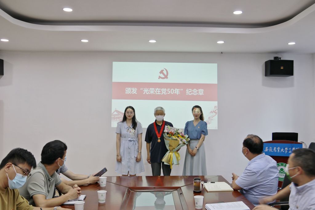 7月1日下午,工学院举办“光荣在党50周年”纪念章颁发仪式,院党委书记任琪为光荣在党50年、原院党委书记徐宏稳颁发“光荣在党50年”纪念章。胸前熠熠生辉的纪念章,是徐宏稳入党50年不忘入党初心坚守使命的沉淀,是入党50年不改赤诚之心砥砺奋进的彰显,是入党50年不悔强农之心热忱奉献的证鉴。