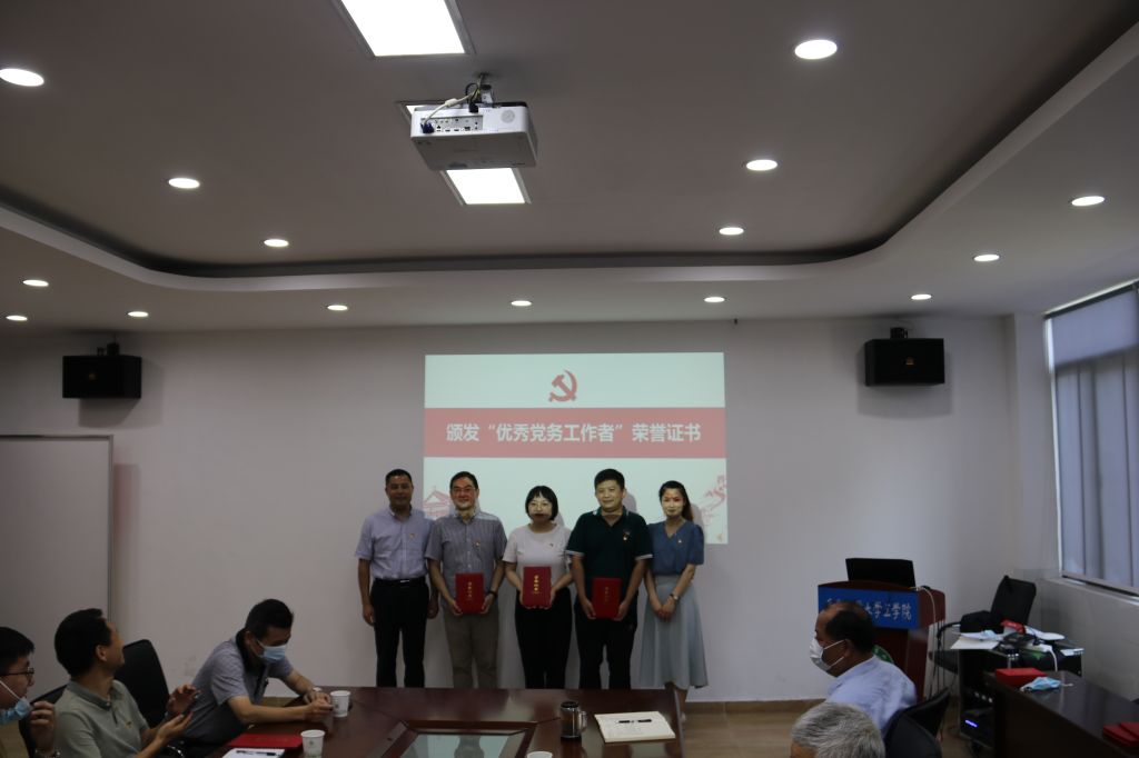 为表彰党内先进,营造崇尚实干、激励担当的干事创业氛围,“七一”当天,学院组织开展了“工学院庆祝中国共产党成立101周年暨‘七一’表彰活动”,对前期各支部推荐提名、党委会审议通过并经公示无异议的15名优秀党员和3名优秀党务工作者进行了现场表彰,工学院党委书记任琪、党委副书记张国学为获得表彰的同志颁发了荣誉证书。