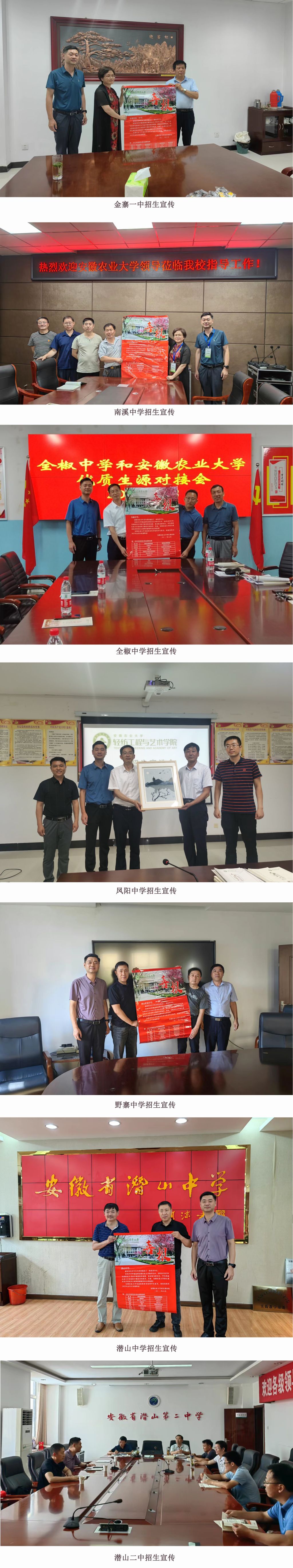 6月23日-29日,院党委书记夏成云,院党委副书记、院长杜兆芳,党委副书记、纪委书记、副院长宋超,副院长陆小彪等组成两个工作组分别赴金寨县第一中学、金寨县南溪中学、滁州市全椒中学、凤阳中学、安庆市野寨中学、潜山中学、潜山二中等优质生源基地中学开展优质生源基地回访和招生宣传活动,与相关学校领导召开座谈交流会,介绍了学校、学院历史沿革、人才培养特色、毕业去向等办学情况,并在学校开展招生宣传,对2022年招生政策、学校特色亮点、分专业录取情况等做了详细解读,并赠送学校2022届优质生源基地中学毕业生考研喜报。