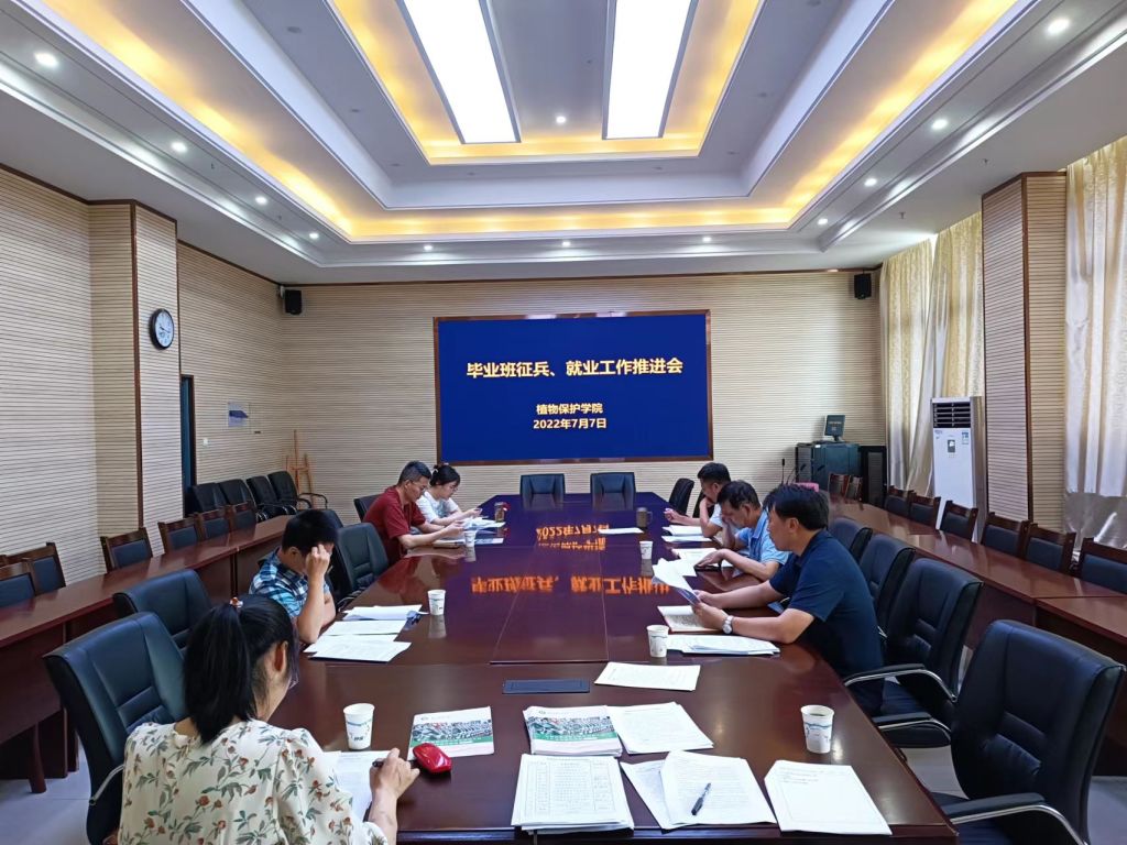 本网讯 7月7日,植物保护学院在中西部综合楼1213会议室召开专题会议,部署推进毕业班征兵和就业工作。学院党委书记张平、常务副院长潘月敏、党委副书记汪小强及2022届毕业班辅导员班主任参加会议。