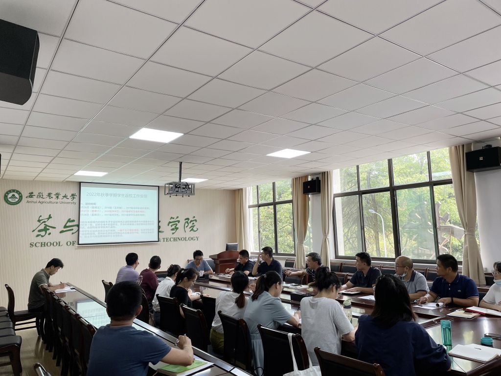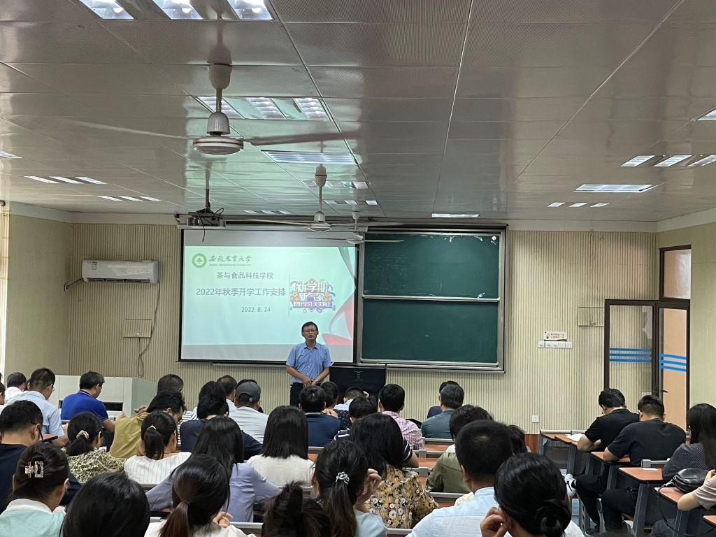 8月24日,茶与食品科技学院召开全院教职工会议,安排部署新学期开学工作和重点工作。会议传达了学校相关会议精神,通报了学院年度重点工作进展。各分管领导分别就党建、意识形态、教学、科研、招生就业、实验室安全管理、学科建设、校园环境整治、疫情防控等工作做了部署。会议要求全院严格落细落实学校疫情防控各项举措和安全隐患排查工作,筑牢安全防线,共同打造平安校园,确保开学安全有序。针对年度重点工作,学院要进一步压紧压实责任,以更加严实的作风,争创更大的业绩。会后,院领导对学院实验室、消防进行了检查,排查了安全隐患。