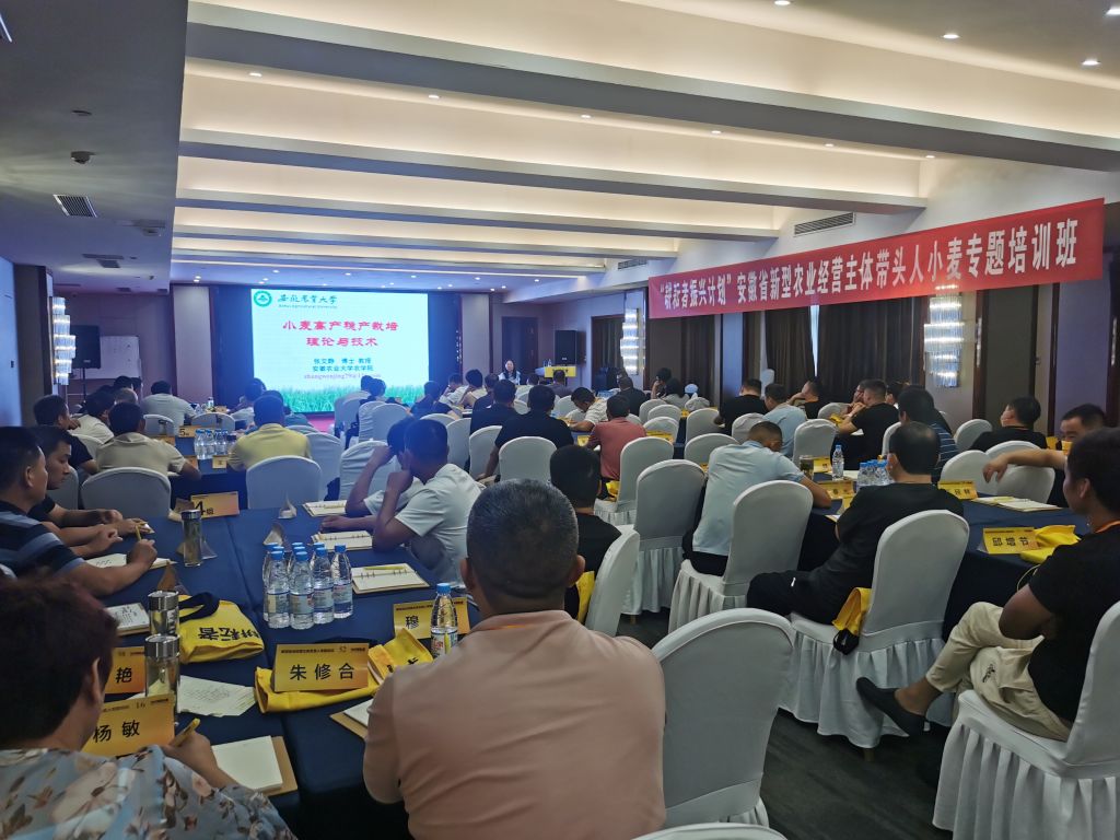 本网讯 8月21日至25日,“耕耘者”振兴计划安徽省新型农业经营主体带头人小麦专题培训班在阜阳市举办,此次培训班由我校承办。安徽省农业农村厅农村合作经济指导处副处长章新振,我校继续教育学院院长胡启涛等参加了培训班开班式。来自阜阳、亳州、淮北、淮南、滁州、蚌埠和宿州等市县(区)农业农村局分管负责人、农民合作社、家庭农场和社会化服务组织负责人共100人参加此次培训。