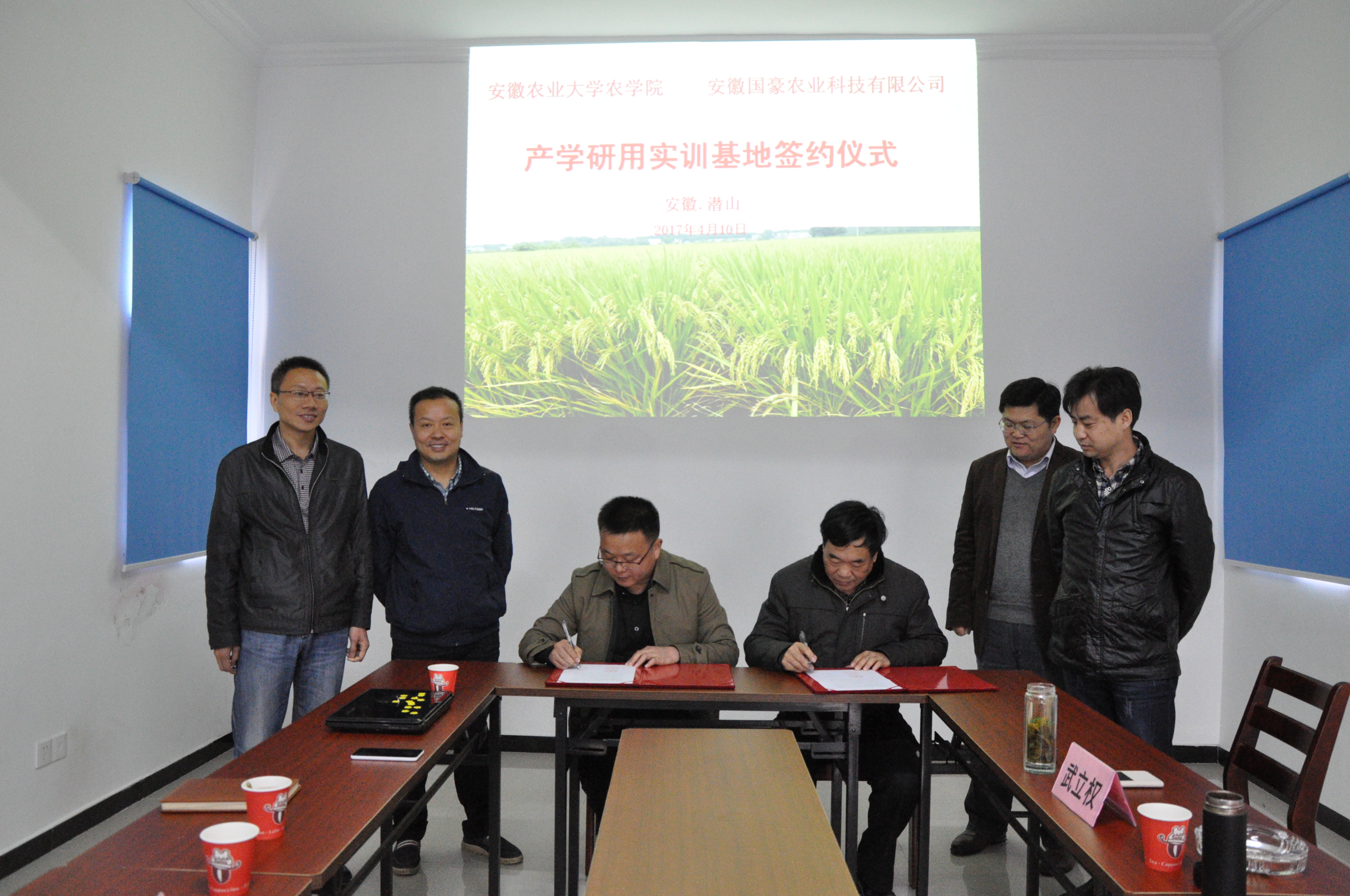 本网讯 4月10日,农学院与安徽国豪农业科技有限公司在安徽国豪潜山县科研基地举行了产学研用实训基地签约揭牌仪式。农学院副院长(主持)李金才,副书记、副院长鄢高翔,副院长常成、武立权,安徽国豪董事长韩仁长及公司主要高管出席了仪式。