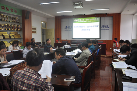 郜红建详细解读了《关于印发安徽农业大学开支“四个专项治理”工作方案>的通知》(校党字〔2017〕21号)文件精神,传达学校关于推进“四个专项治理”会议精神,他要求全体教职工要提高认识,高度重视,实事求是和客观对待四个专项治理工作,并从自查自纠、落实整改、时间节点等方面提出了具体要求。(通讯员:程玉峰)