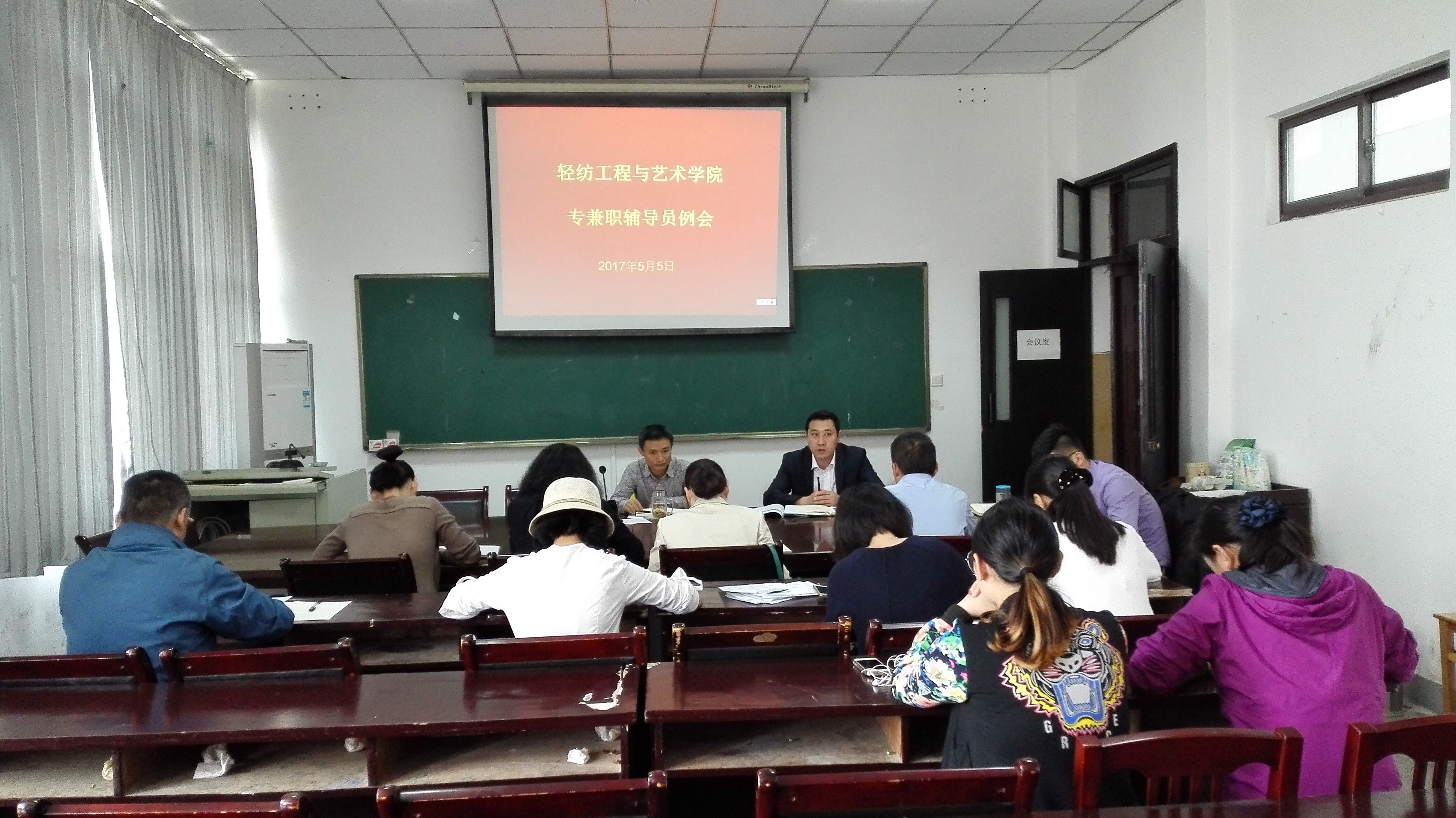 本网讯 5月5日上午,轻纺工程与艺术学院在学院会议室召开专兼职辅导员工作例会,院专兼职辅导员参加了会议。会议由院党委副书记吕剑秋主持。