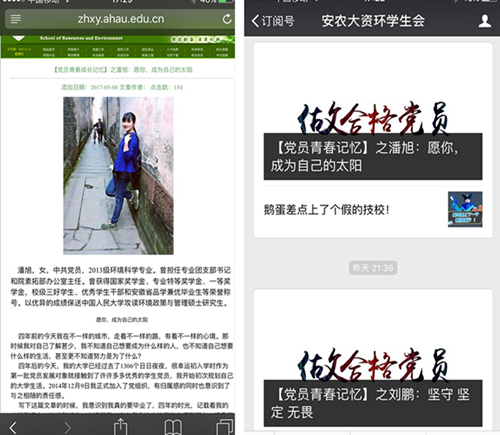 本网讯 5月8日起,资源与环境学院党委开始在学院网页和学院微信公众号(http://zhxy.w1.ahau.edu.cn/;微信号:anauzhxy)同步推出2017届毕业生《党员青春成长记忆》,活动一经推出得到了毕业生党员的积极参与和广大同学的纷纷点赞。