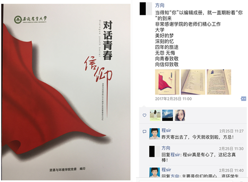 一份份青春成长记忆,不仅是毕业生党员的一份特殊的“思想汇报”,更为广大同学留下了一份珍贵的礼物。学院党委编印的《对话青春信仰—2016届毕业生党员青春成长记忆》一书,在广大毕业生党员中产生了强烈认同感,2016届环境工程专业党员方向拿到该书在朋友圈中分享到:当得知“你”以编辑成册,就一直期盼着“你”的到来,非常感谢学院老师们精心工作,大学,美好的梦、深刻的忆,四年的旅途,无怨无悔,向青春致敬、向信仰致敬。同时,该书在学院党员教育、入党积极分子培养和新生入学教育中发挥了积极的作用。