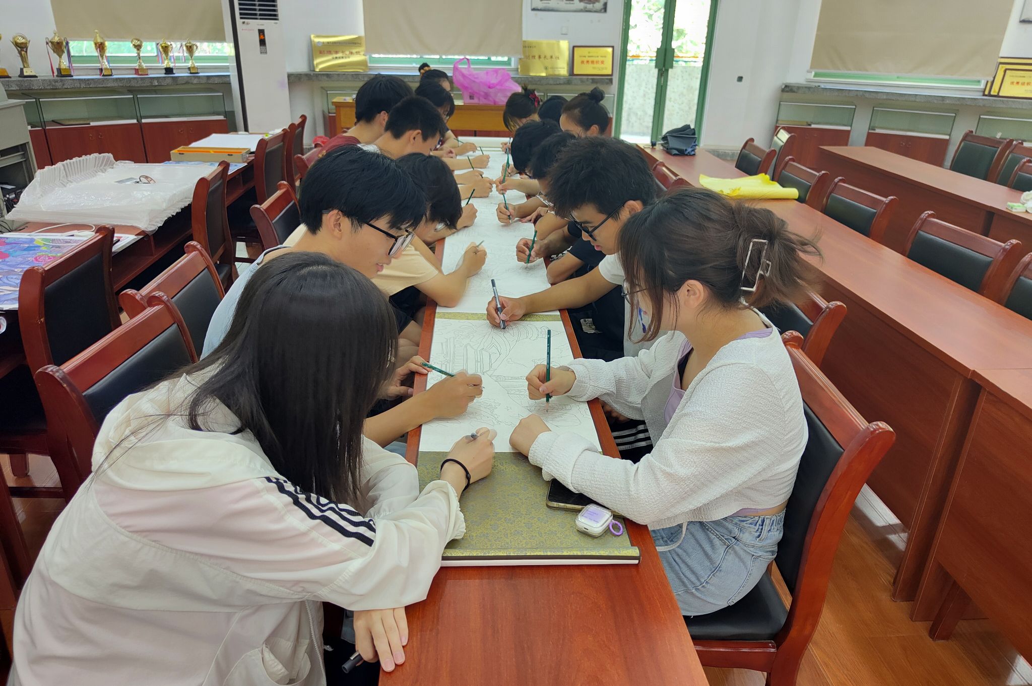 在“我为祖国颂赞歌”长卷绘画活动中,留校学子用手中的画笔展现祖国改革发展的巨大成就,在一幅幅画卷中重温一个个历史时刻,用一根根线条抒发当代学子的爱国热情。虽然画作形式各不相同,但画卷内容丰富多彩,通过历史长卷的绘制,同学们更好的感悟革命先烈奋斗的艰辛、当下生活的来之不易,更坚定了传承红色基因、赓续红色血脉的信念。