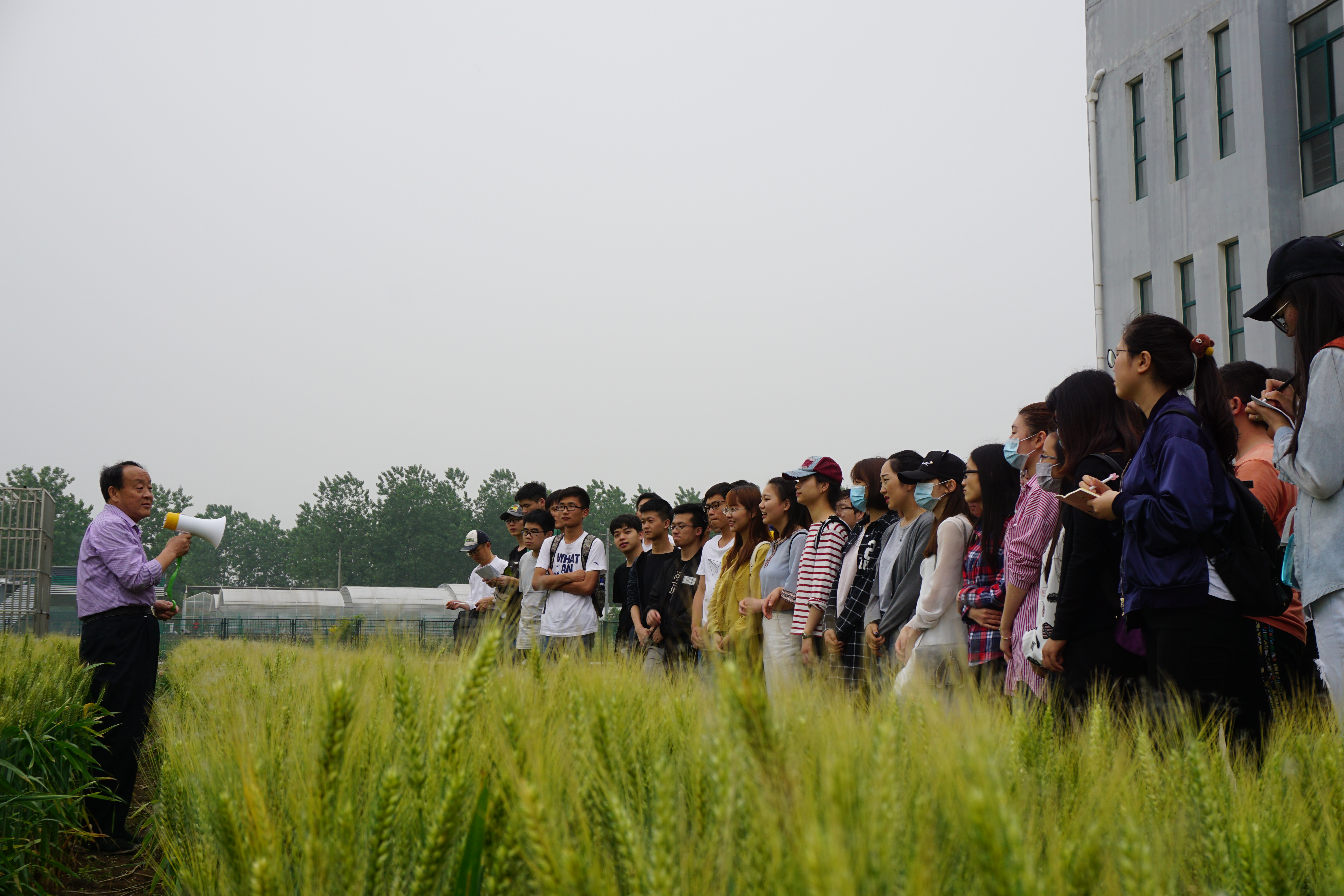 在大杨店实践基地,姚大年教授从小麦栽培、遗传育种、推广繁殖、种子生产和加工等方面进行全面讲解,并带领同学们实地进行病虫害鉴别。