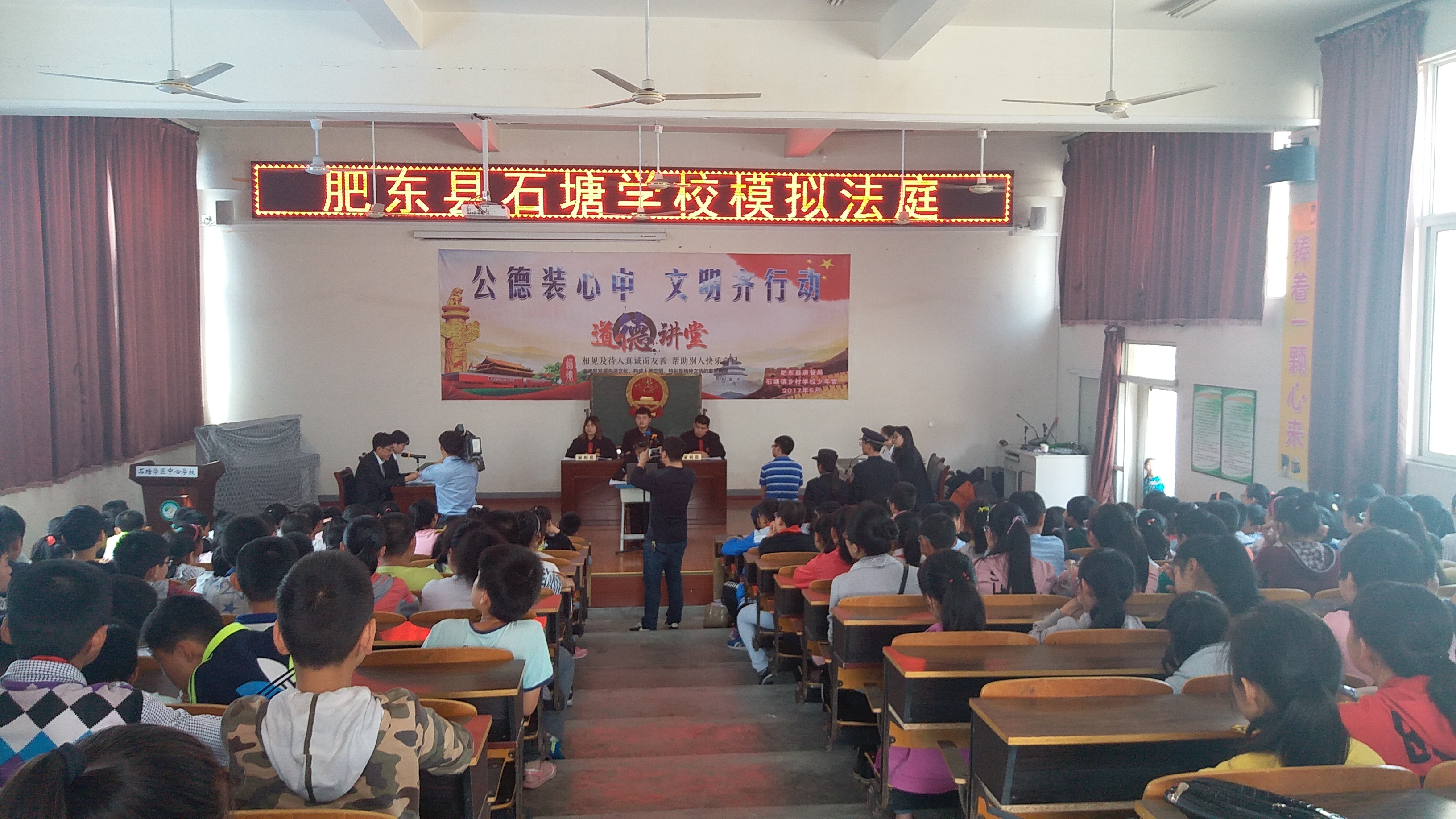 本网讯 为深入推进“两学一做”学习教育常态化制度化,认真落实学校党委关于每月主题党日教育实践活动工作的部署,5月12日,人文社科学院第二教工支部党员、法学学生党支部的志愿者们来到了肥东县石塘镇的石塘学校和龙城学校,给当地的学生送来了别开生面的“模拟法庭”表演。