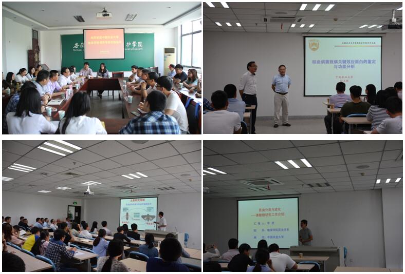 李海滨代表中国农业大学植保学院表示感谢,他指出双方拥有很好的合作交流基础,安农大在人才培育、学生培养上拥有独特优势,希望进一步加强友谊,深入交流,密切合作,为两院师生提供更多的交流机会。孙文献、沈杰副院长分别对中国农大植保学院师资、科研、研究生招生、培养方面进行了详细的介绍。
