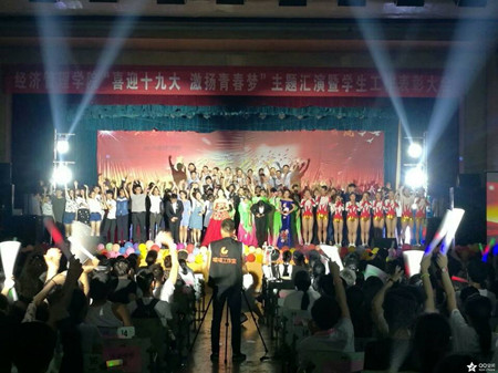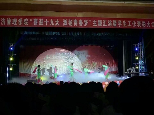本网讯 5月22日晚7点,经济管理学院在校大礼堂隆重举办“喜迎十九大 激扬青春梦”主题汇演暨学生工作表彰大会,校学生处处长彭庆刚、保卫处处长涂德润、组织部副部长葛红、纪委办、监察室、审计处纪检监察员邹兴业、校团委副书记任琪和学院党政领导以及近2000名学生出席参加了大会,会场气氛十分热烈。