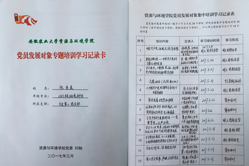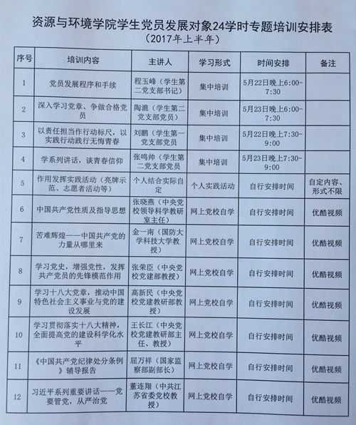 学院严格按照《中国共产党发展党员工作细则》和学校学生党支部标准化建设要求,制定了《资源与环境学院学生党员发展对象24个学时专题培训安排表》,培训以集中学习、网上党校自学和主题实践相结合形式开展,集中培训以学生党支部书记和学生党员讲师团成员为主,网上党校学习以中央党校知名教授张晓燕、张荣臣、高新民和国家监察部副部长屈万祥、中共江苏省委党校教授董连翔等网络党课视频为主,培训内容涉及学习党章党规、党史、习近平总书记系列重要讲话、十八大精神、入党程序和手续和学生党员朋辈辅导等。